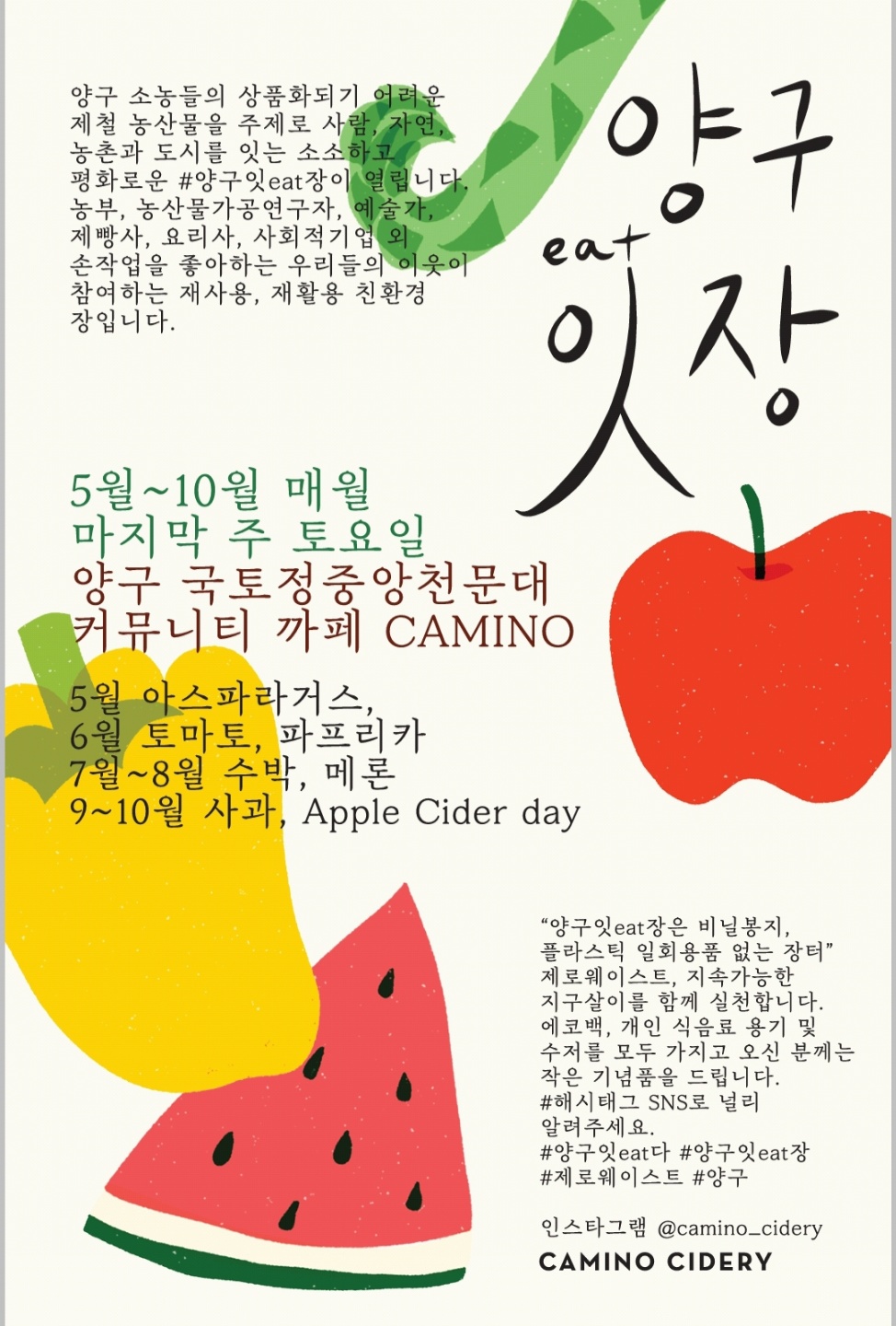 양구잇장은 5월 아스파라거스를 시작으로 6월 토마토·파프리카, 7~8월 수박·메론, 9~10월 사과·Apple Cider day로 주제 농산물을 바꿔가며 매월 마지막 주 토요일 오전 10시부터 5시까지 커뮤니티 카페 까미노에서 진행될 예정입니다.