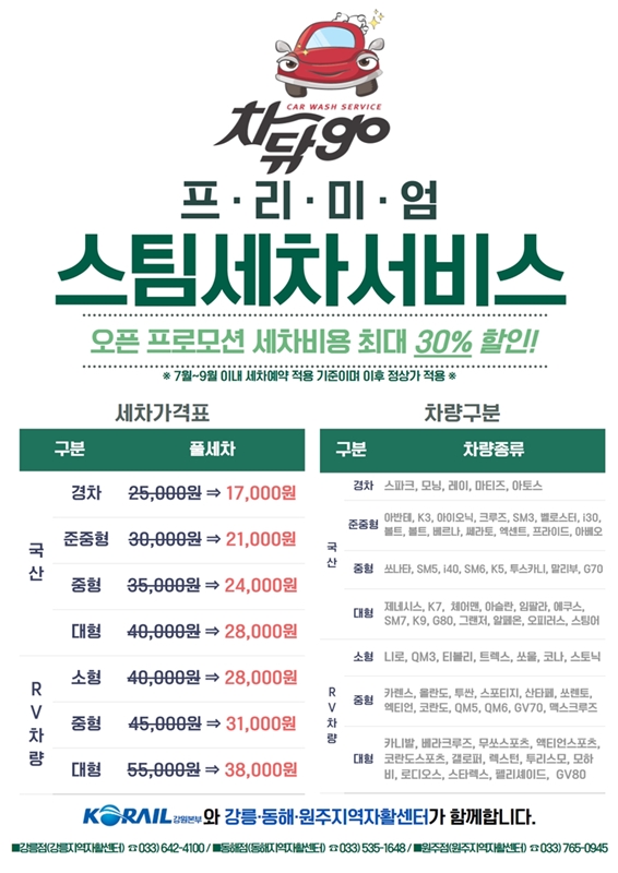 코레일 세차사업단(차닦go)은 전화 예약(강릉점 033-642-4100, 동해점 033-535-1648, 원주점 033-765-0945) 후 이용 가능하며, 차종별로 프리미엄 내·외부 스팀세차 서비스를 제공받을 수 있습니다. 7월 29일부터 9월 30일까지 3개월간 시행되는 오픈 프로모션을 활용하면 기존 가격보다 30% 할인된 가격에 이용할 수 있고, 프로모션 기간 내에 세차 서비스를 예약하면 프로모션 기간 종료 후에도 할인된 가격으로 이용할 수 있습니다.