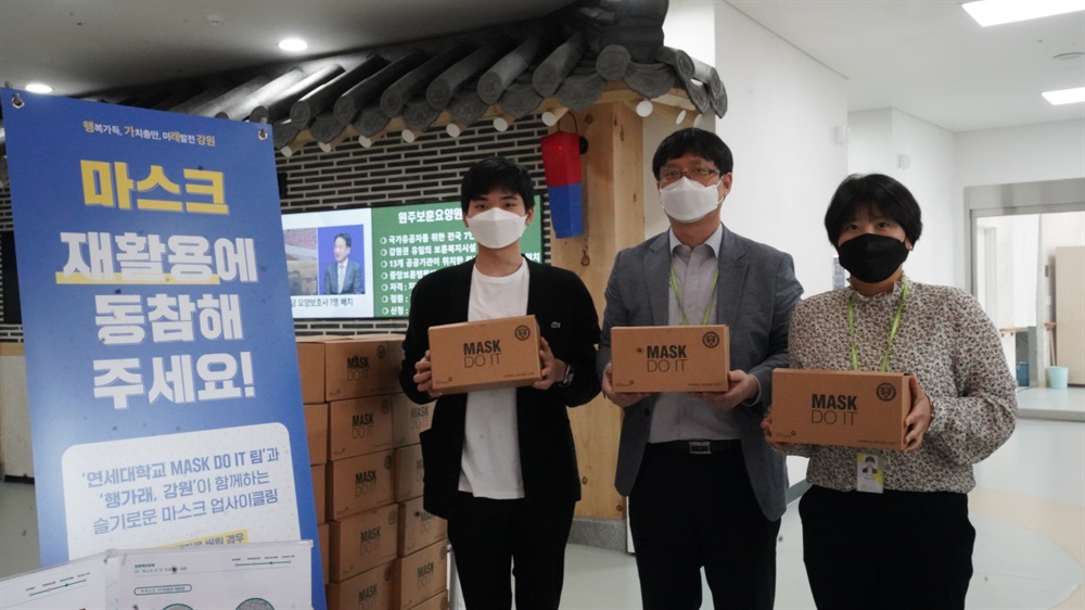 이 같은 고민은 국민건강보험공단, 대한석탄공사와 같은 공공기관들과의 협업으로 마스크 수거함과 살균소독기를 설치한 뒤 ‘마스크 버리는 날’을 정해 수거하는 방식을 진행할 수 있게 되면서 해소될 수 있었어요. 연세대학교 미래캠퍼스와 아파트 단지 1곳에도 같은 방식으로 마스크가 수거되었고요. 사업 시행 전에 원주시 공공기관에 일회용 마스크 수거의 필요성과 효율적인 수거 방식에 대해 홍보했고, 각 공공기관들이 취지에 깊이 공감했기 때문에 가능했죠.