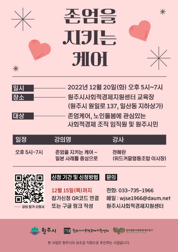 ○ 참여 대상 : 존엄케어, 노인돌봄에 관심있는 사회적경제 조직 임·직원 및 원주시민